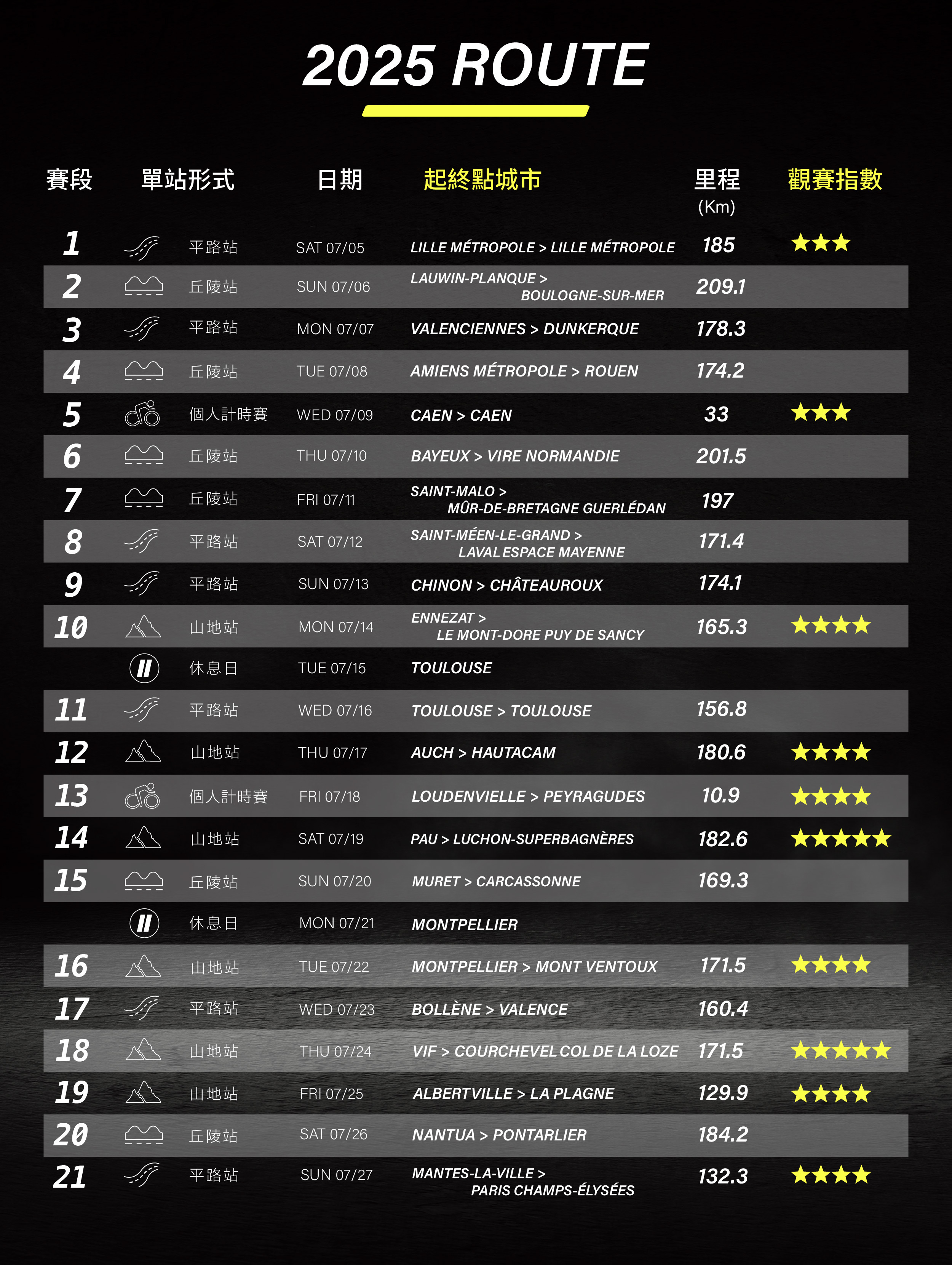 2025 年環法自行車賽將於7月5日至7月27日舉行,賽程全長 3,320 公里,共有 21站,睽違五年,自2020後首次全程僅在法國境內進行。本屆賽事將從法國北部城市里爾(Lille)出發,最終在巴黎香榭麗舍大道(Champs-Élysées)結束,這也是香榭麗舍大道第 50 次成為終點站。