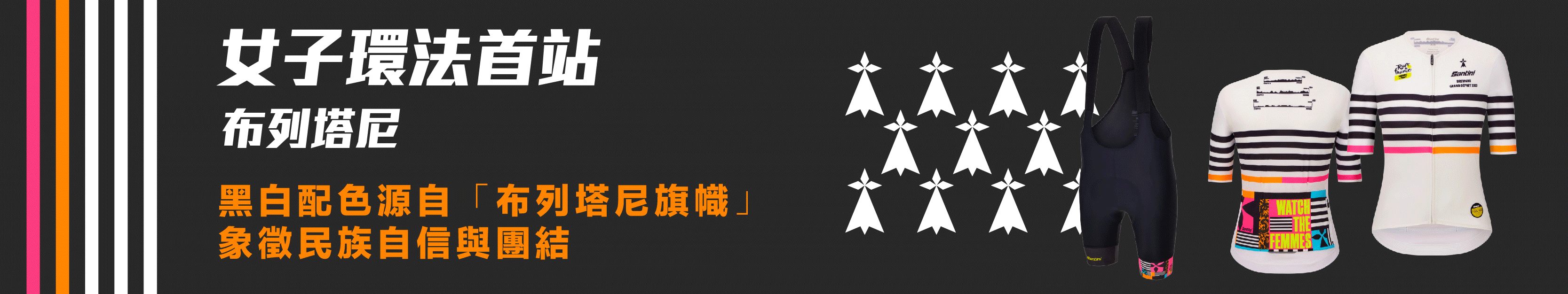 為了女子環法賽( Tour de France Femmes Avec Zwift)所設計的盛大啟程系列,靈感來自布列塔尼的旗幟—Gwenn ha Du,在布列塔尼語中意為“黑與白”,這款經典設計致敬該地區豐富的文化遺產,也融入了比賽的現代精神。
