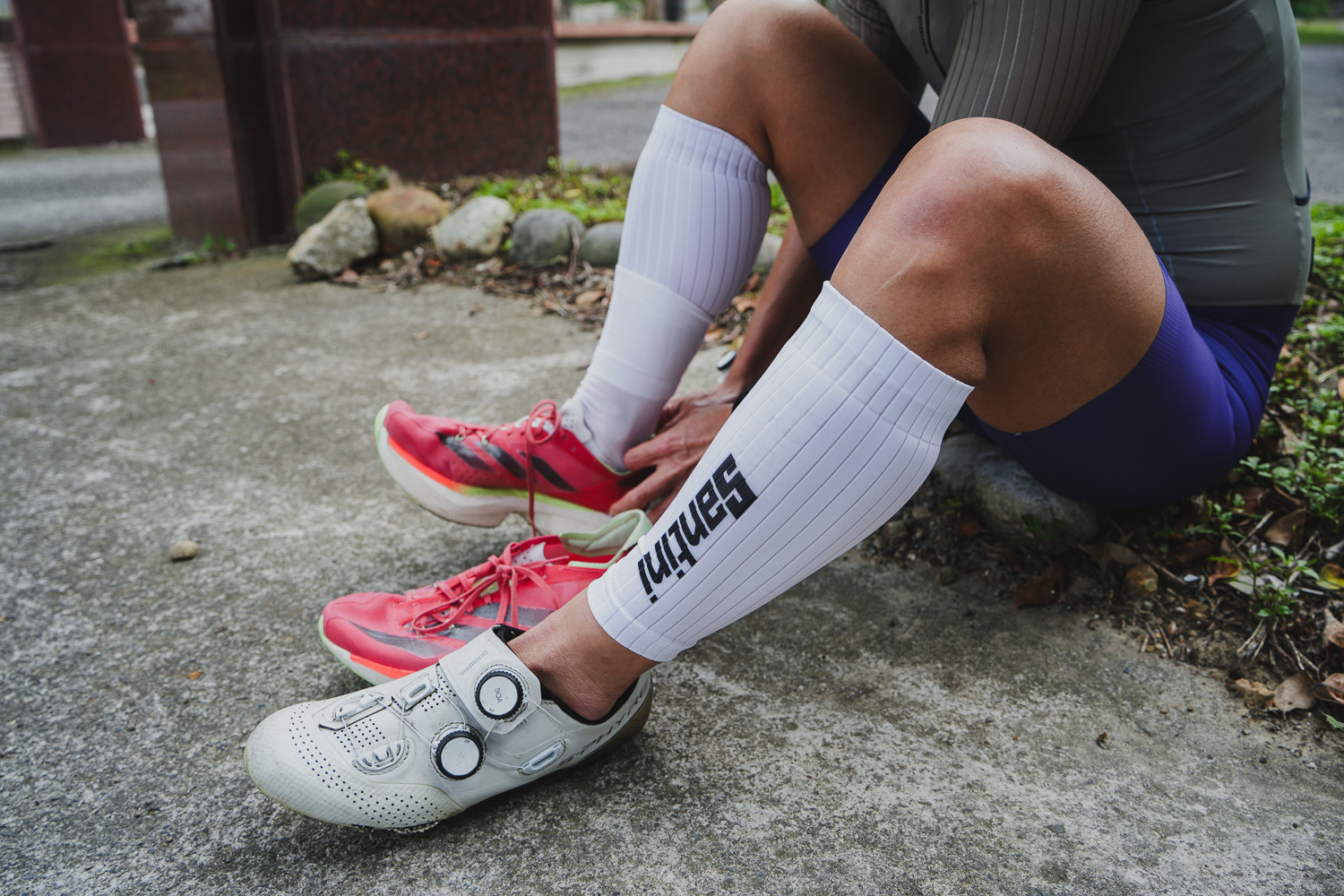 三鐵的優勢: 反觀 IRONMAN 等三鐵賽事,規則對此幾乎採取開放態度。選手可以穿著完整覆蓋整個小腿的 Santini Aero 腿套。這意味著三鐵選手能比職業公路車手多出近 50% 的空力覆蓋面積,完整包裹住小腿這個關鍵的迎風部位。