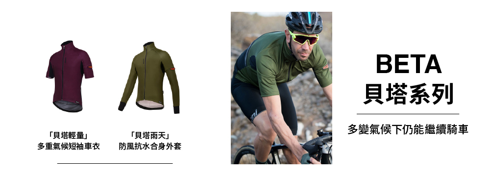 由Gore Windstopper® 面料製成一系列秋冬系列服飾,家族成員包含:「貝塔輕量」多重氣候短袖車衣 / 「貝塔雨天」防風抗水合身外套 /「貝塔冬天」防風抗水保暖外套(台灣未引進),競賽級貼身剪裁 透過使用不同厚薄度的Windstopper®防風抗水面料來提供冬季舒適的保護。這也是Trek-Segafredo用於訓練和比賽的人身部品。