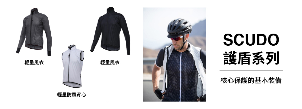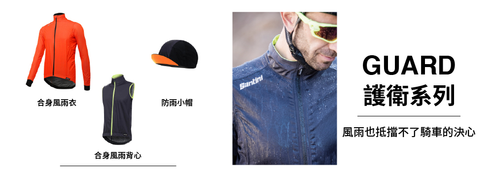以單層多功能的布料提供完全的保護和舒適。防風抗水的Scudo「護盾」布料,舒適的競賽合身剪裁,風衣袖口為橡膠束口,確保冷風及雨滴不會進入風衣內。後方為Santini反光logo,提供更佳的可視性。背心合身且輕量。可以很容易地收納在自己的拉鏈袋中,寒風細雨下的最佳選擇。