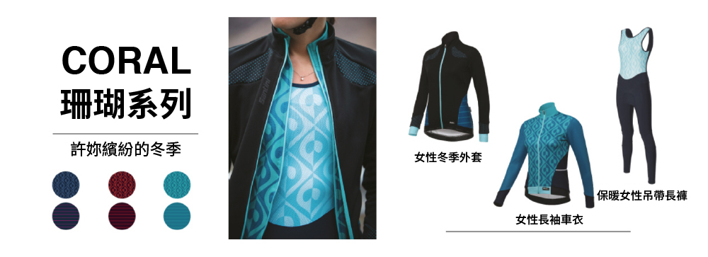Coral「珊瑚」系列是我們為了女性設計,在冬季騎行時使用的完美服裝。一系列孔雀圖紋設計,繽紛又有型,溫暖女性騎士的冬季,珊瑚系列讓女性從吊帶長褲,長袖車衣,到女性Windstpper®冬季外套一應俱全,色系風格整體搭配,有三種顏色可供選擇。這也是女子世界冠軍 Lizzie Deignan 與Santini的聯名系列。 Lizzie的建議是15-20度時可使用這款保暖車衣為基底,搭配保暖吊帶,或者搭配Coral「珊瑚」外套,以應對更寒冷天氣和多雨的環境。