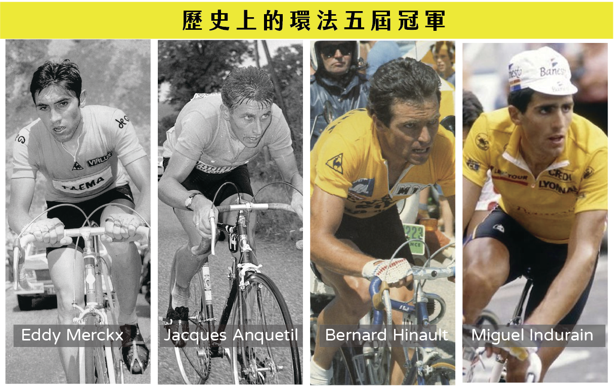 不過也因為他,讓環法的影響力觸及更多世界的角落。而真正史上仍留有紀錄的五次環法冠軍就是車神Eddy Merckx、Jacques Anquetil、Bernard Hinault、Miguel Indurain。然而隨著時間的推移,慢慢的這些神人也快被世人給淡忘了。