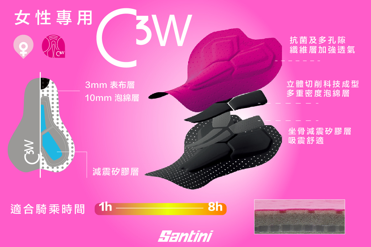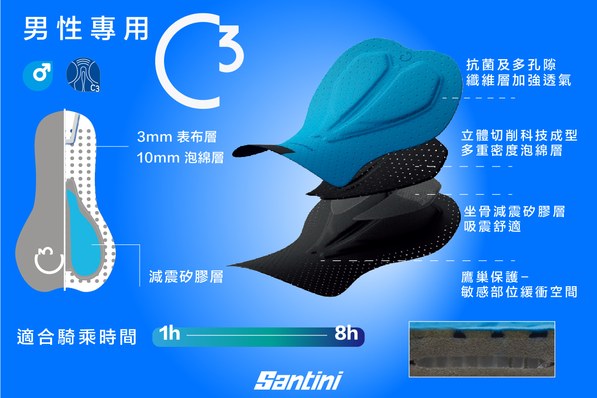 專為長時間騎乘設計的襯墊,在設計與材質的挑選上,會考慮更多在長時間騎乘的狀況之下,使用上可能會產生的感受,盡可能降低對肌膚的摩擦。理想的襯墊會考慮接觸的表布是否細緻,但又不可完全光滑,更進一步的具有抗菌防臭功能。而內層的核心也會因騎乘時間而有不同的支撐度。Santini 專為長距離騎乘所開發的 C3 襯墊,具有抗菌超微細纖維表布,邊緣則是採用新開發的「熱縫邊」無縫線科技,圓順的邊緣可減少活動時產生的摩擦。藉由經 50 年淬煉的剪裁設計,讓車褲穿在身上時處於「均勻緊繃」的狀態,沒有多餘的布料、皺摺,因此減少摩擦情況產生。大部分有經驗的車手都認同,投資一件好的車褲是讓騎乘感受提升及避免座墊瘡的最好方法。