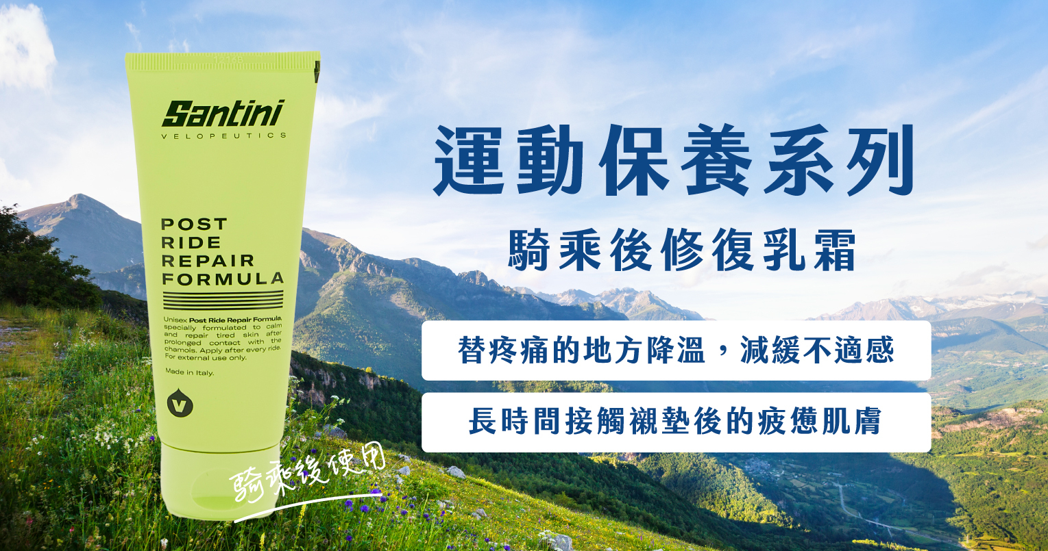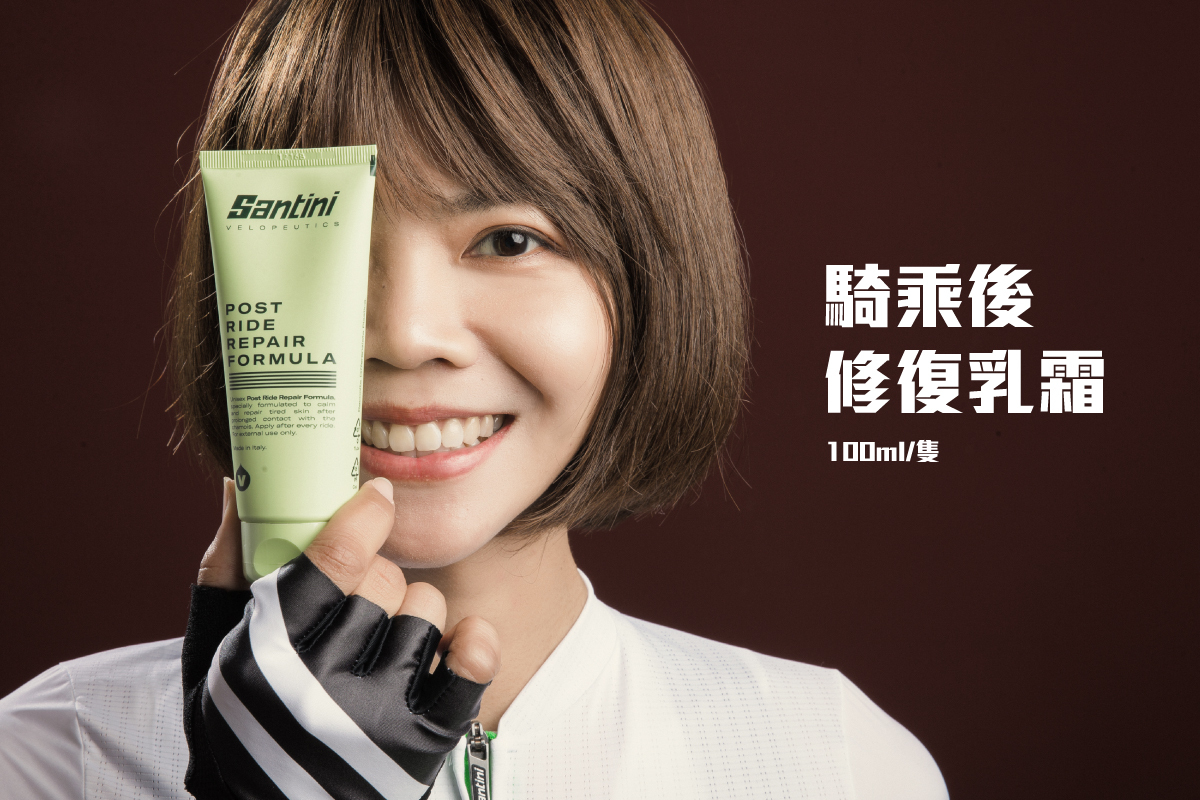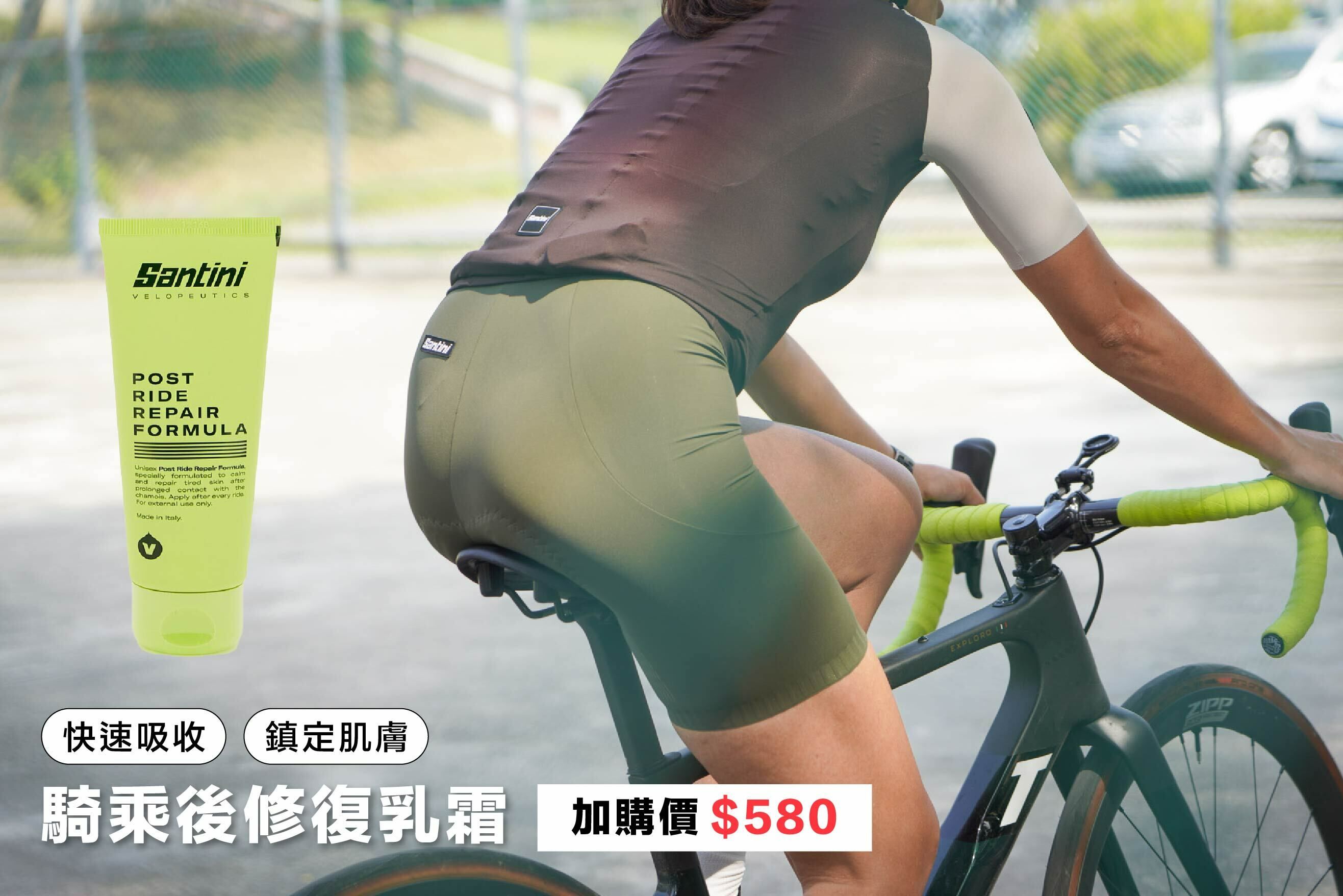 結束騎乘後,可使用 Santini 專為自行車騎士開發的騎乘後修復乳霜,在淋浴並擦乾後立即將拇指指甲大小的乳霜擠在手上,然後開始按摩到您身體可能出現任何酸痛的所有部位,可舒緩與鎮定長時間接觸襯墊後的疲憊肌膚。