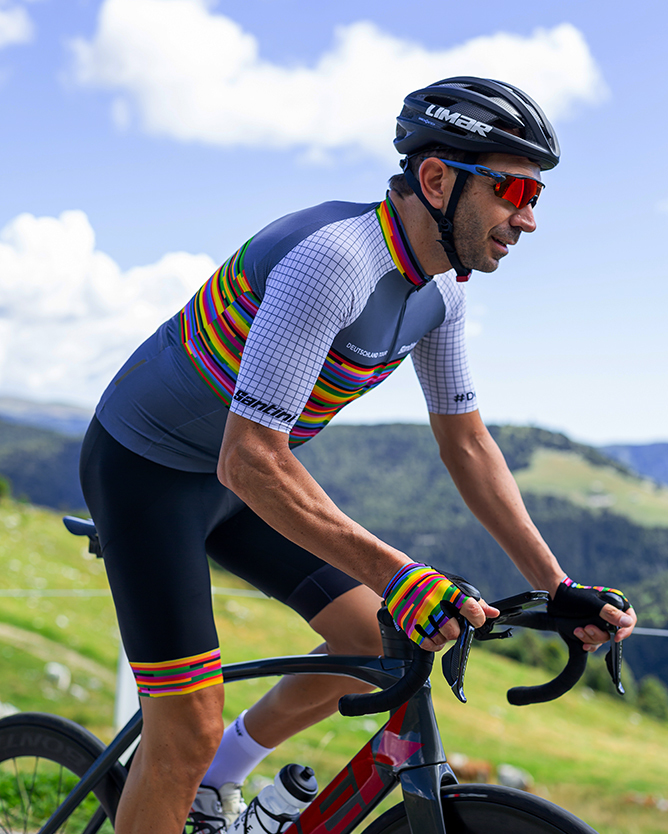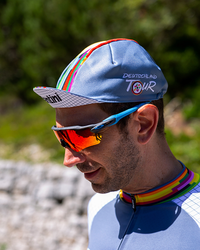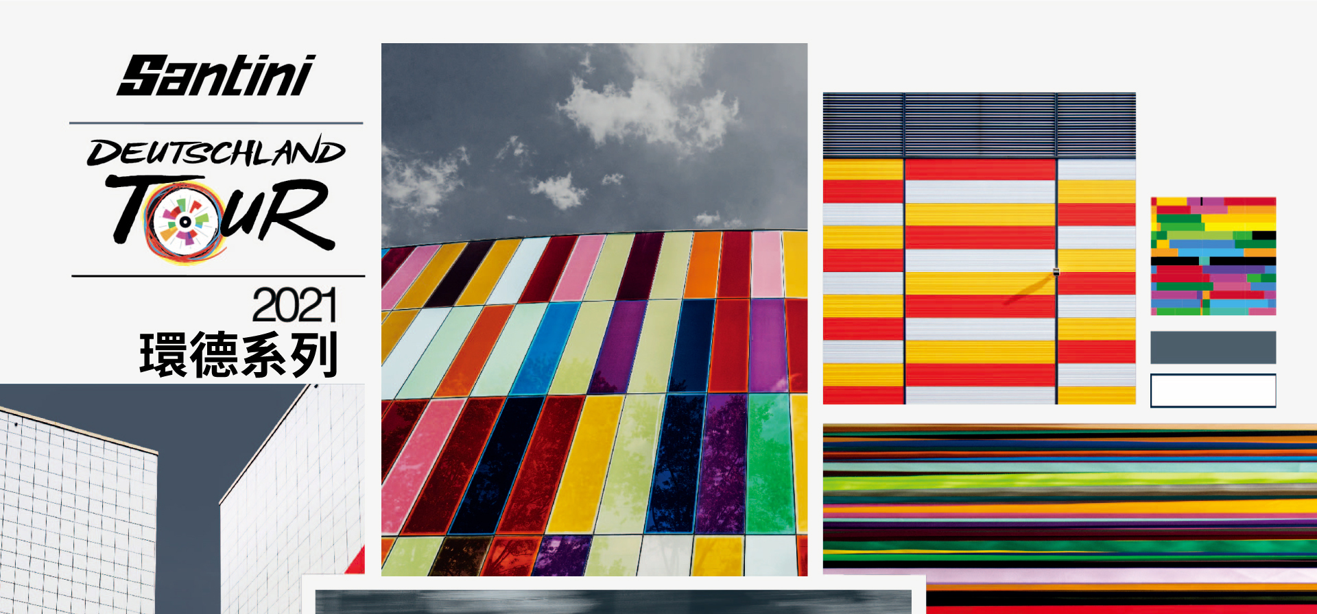 為了向環德國致敬,我們特別設計了紀念車衣,包含醒目的多彩調色盤,以新穎大膽的設計成為賽事的標誌。分佈在車衣前後方的色塊,是從前一屆環德國的一個分站的主集團照片中抽取出來,傳達純粹的動感和速度感,已成為點燃這場精彩比賽的象徵。