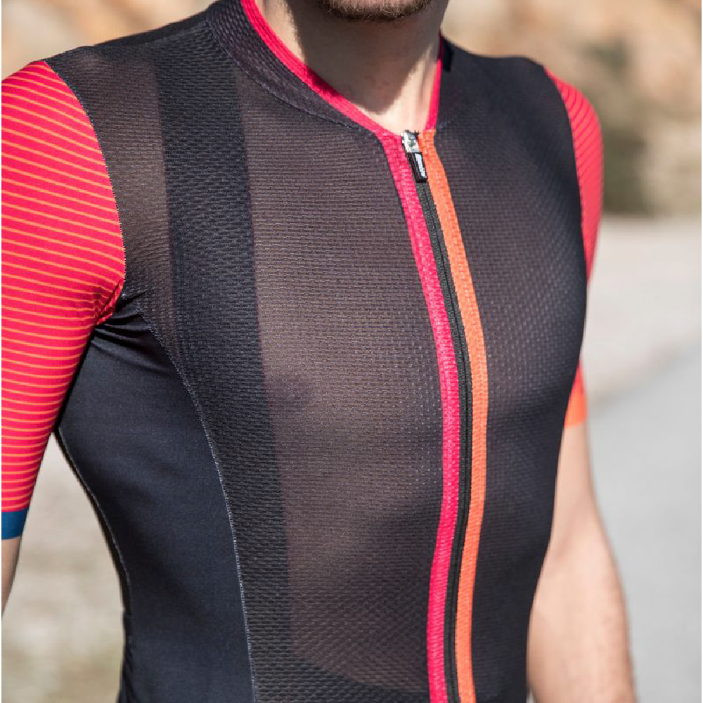 洞洞車衣早在多年前就已經盛行了,TONO2色調二代這件幾乎半透明的車衣有什麼特別的地方嗎?它採用Sesia 「賽西亞」(這名字聽起來就很性感)高彈性網布,輕、薄、有彈性又柔軟,意思是車衣可以做成完全貼身,男女穿都合適,光這點就打敗市場上幾乎所有的洞洞車衣了。貼身又透氣,感覺有穿跟沒穿一樣,皮膚可以直接呼吸到空氣,在騎乘的過程中真是無比的舒暢,超脫傳統車衣帶給我們的感受。