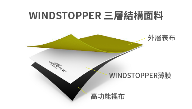 三層結構就是讓 WINDSTOPPER面料同時能達到防風、透氣、保暖與抗水等多種機能的主要因素。