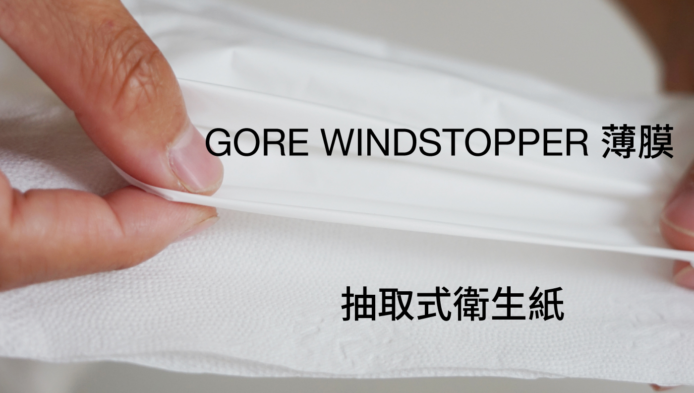 借助GORE-TEX 薄膜技術,GORE公司進一步研發出 GORE WINDSTOPPER薄膜,除了防水、更輕更薄外,透氣度更高。當它黏合在高功能裡布和外層表布之間,就成了我們所說的 #GORE WINDSTOPPER 面料。