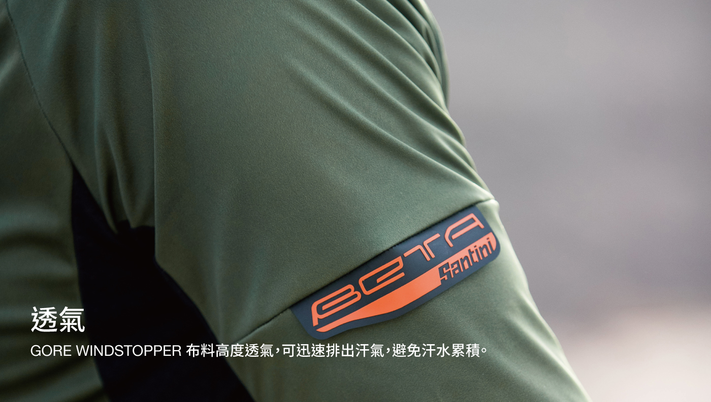 Santini 「貝塔輕量」多重氣候短袖車衣,採用170 g/m² 的Gore® Windstopper® 三層阻風面料製成