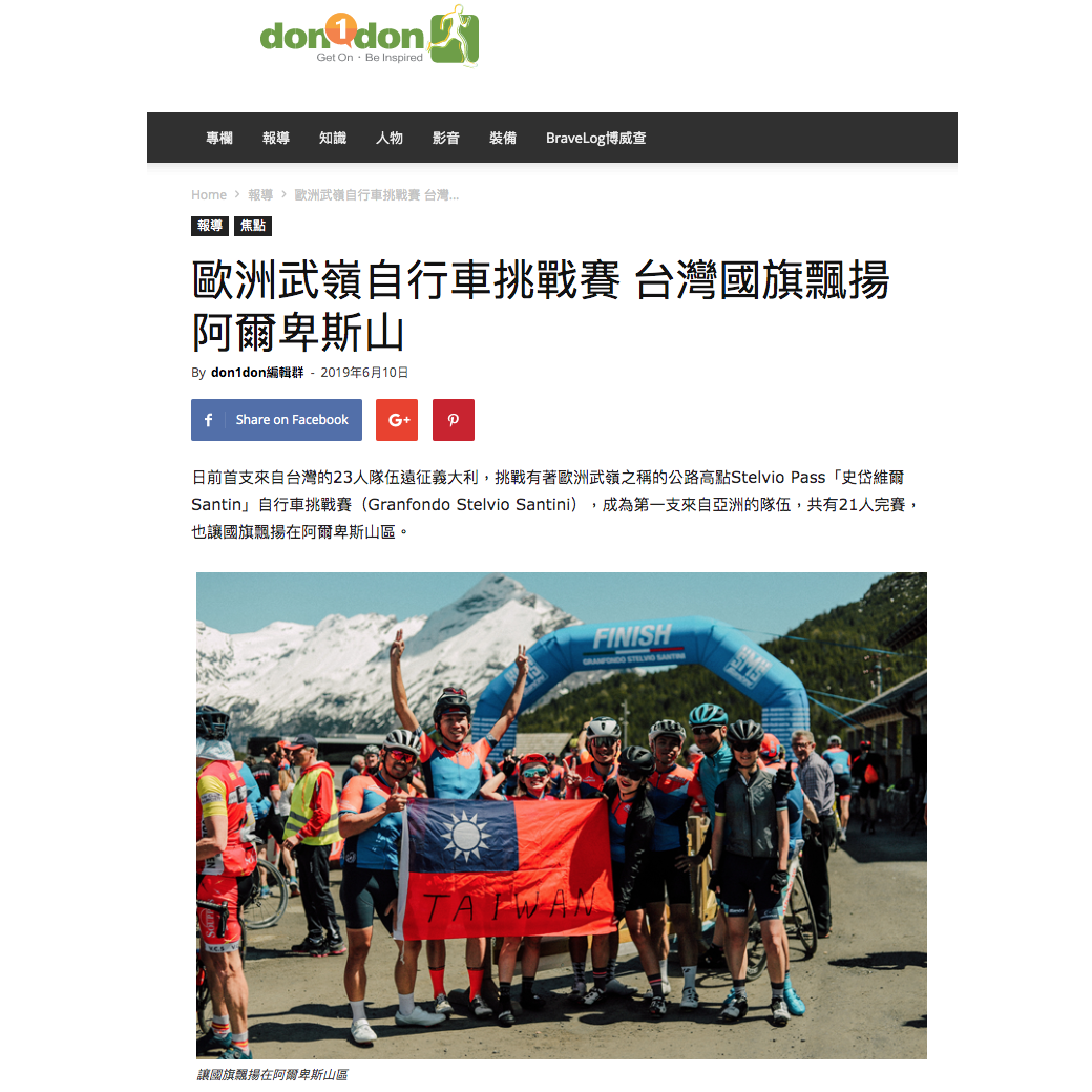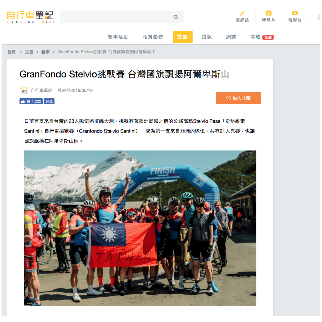 2018年起,我們開始參與GranFondo Stelvio,也成功地將第一個台灣騎士送上山頭。2019年我們成功的組織了第一個亞洲團體參與Stelvio的活動,也寫下新的一頁。展望2020,希望我們能幫更多有興趣的人圓一個到歐洲騎車的夢!