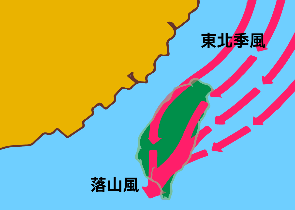 由於恆春半島的中央山脈高度降低至400-1000公尺左右,每年從10月到次年4月,東北季風翻過山脈而下,強勁的下坡風直撲恆春半島西岸,襲捲在背風坡的車城、牡丹、恆春等地區。落山風瞬間強度可達6、7級,相當於輕度颱風的威力。即使是小汽車,機車等往往都不敵強勁的瞬間風速,被吹翻造成人員傷亡。