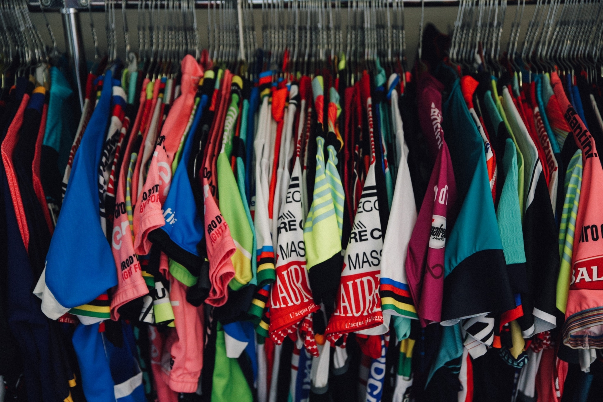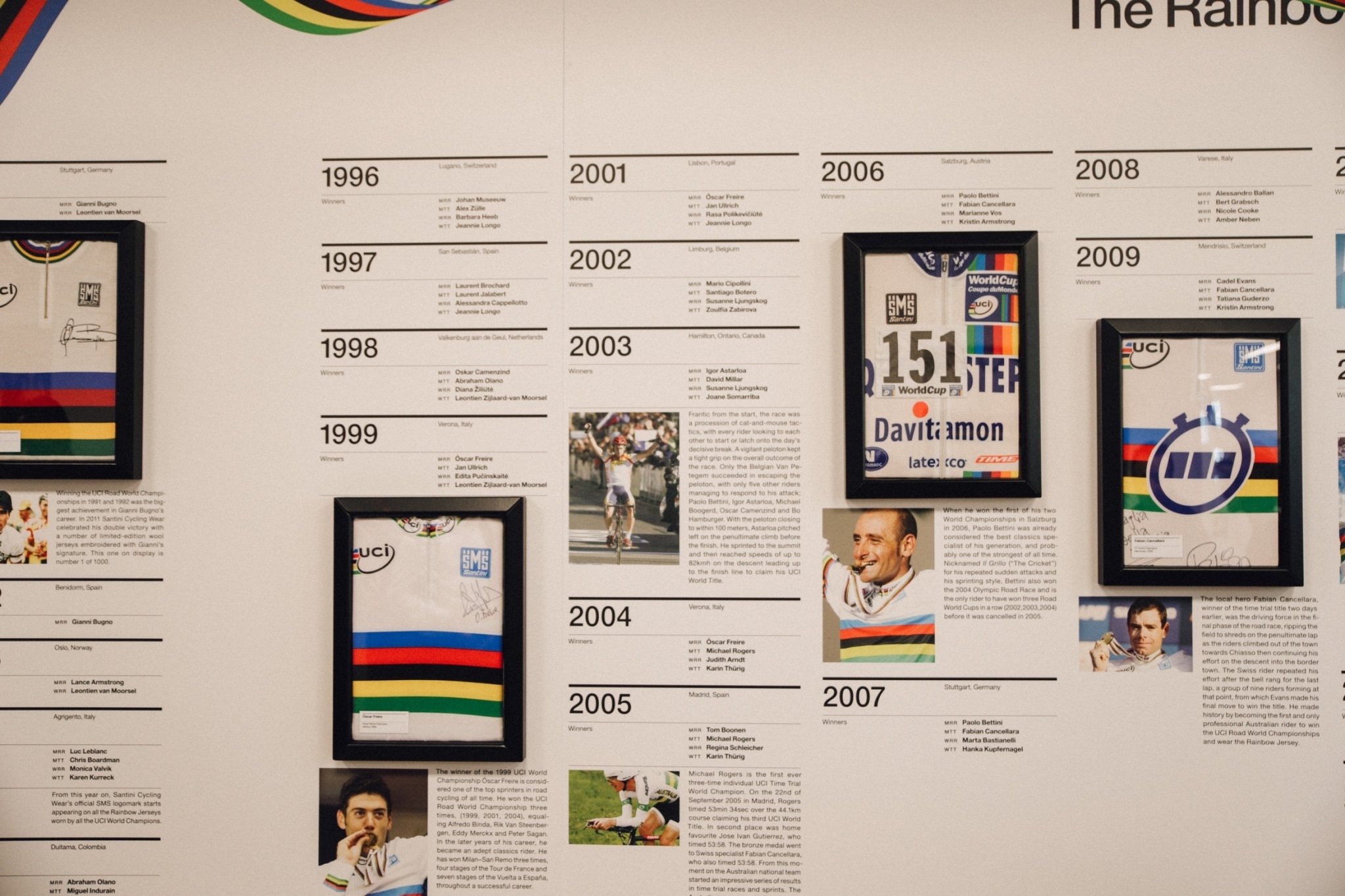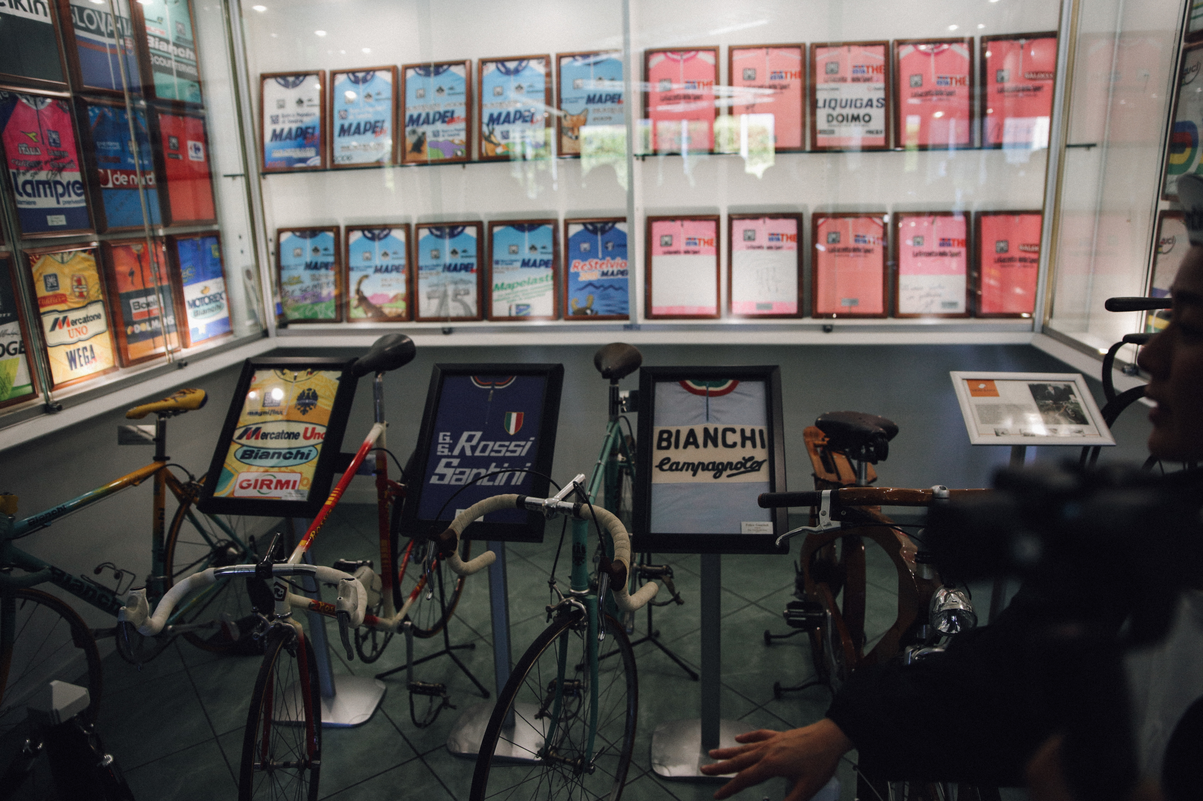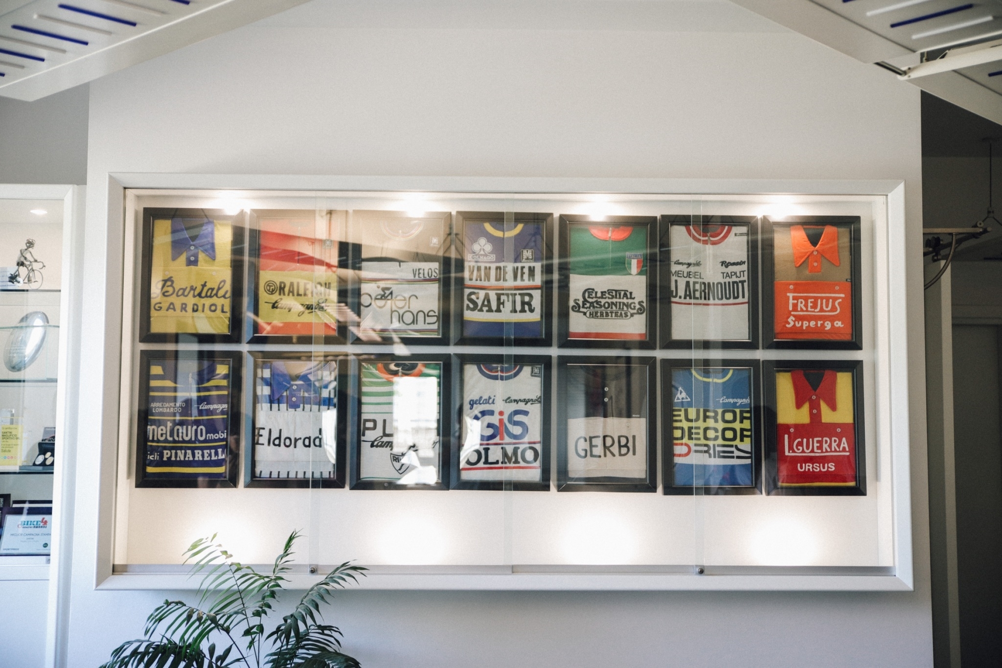 走進Santini,映入眼簾便是傲人的歷史軌跡。井然有序的排列著歷年環義冠軍粉紅衫、選手紀念衫以及各式賽事紀念衫,特別與選手當年使用的自行車一同展示著,驕傲地與來訪的人展示背後所蘊含的故事。