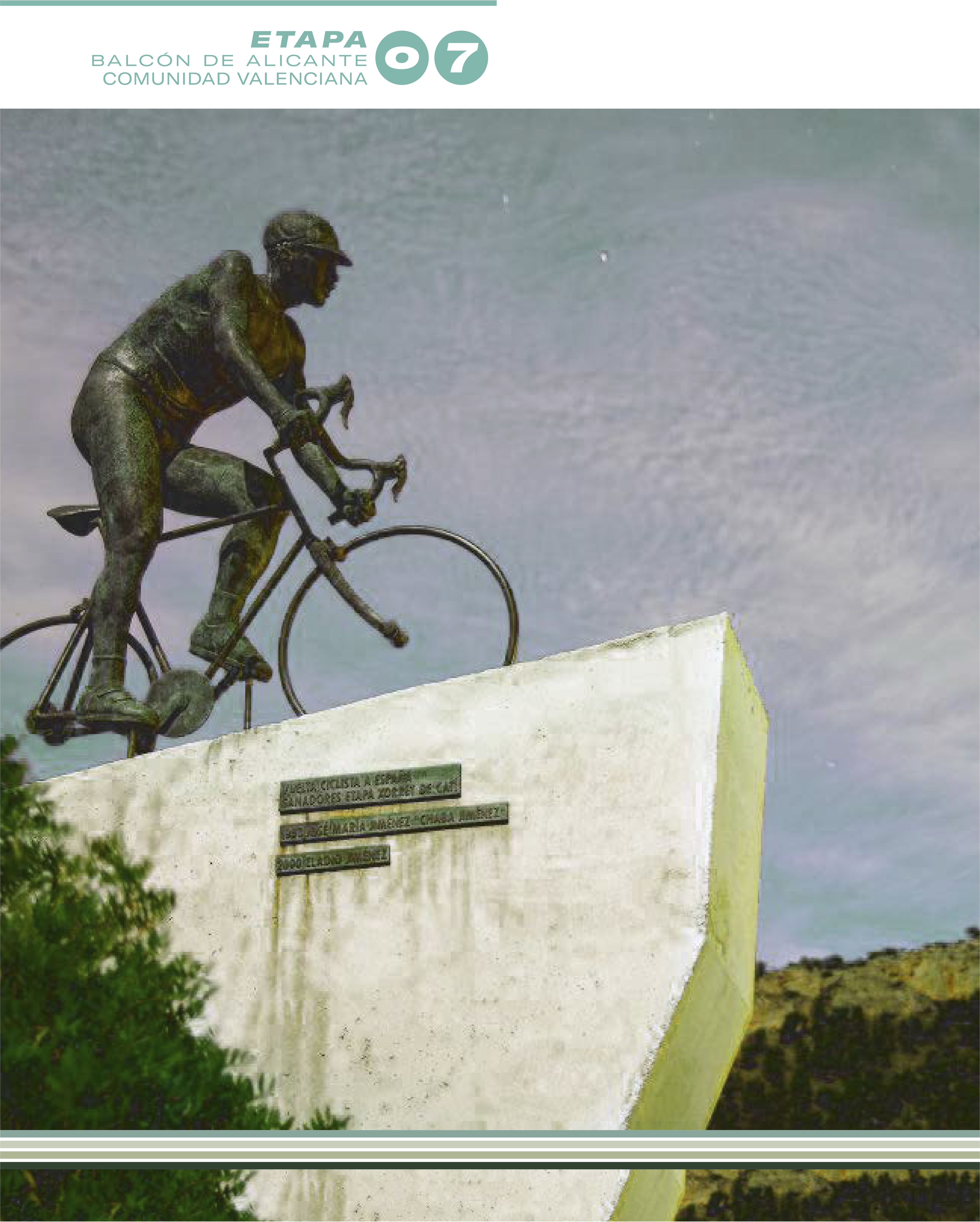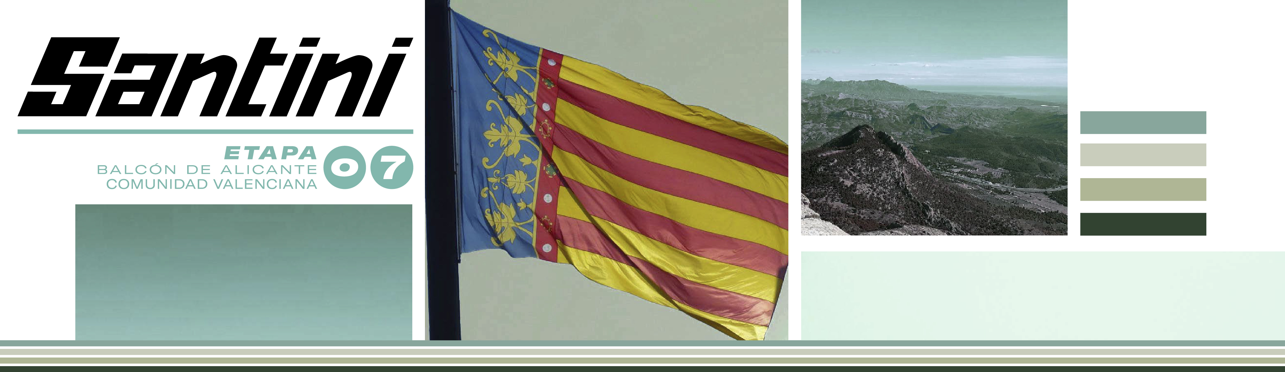 環西的第七站從Gandía出發,終點設在Balcónde Alicante的山頂。我們從下面樹木繁茂的巴倫西亞景觀的壯麗景色中汲取靈感,獲得分站專屬的顏色和設計,並自豪地將山頂上謙遜的岩石雕刻:Estima la Natura--尊敬自然,轉印在車衣上。