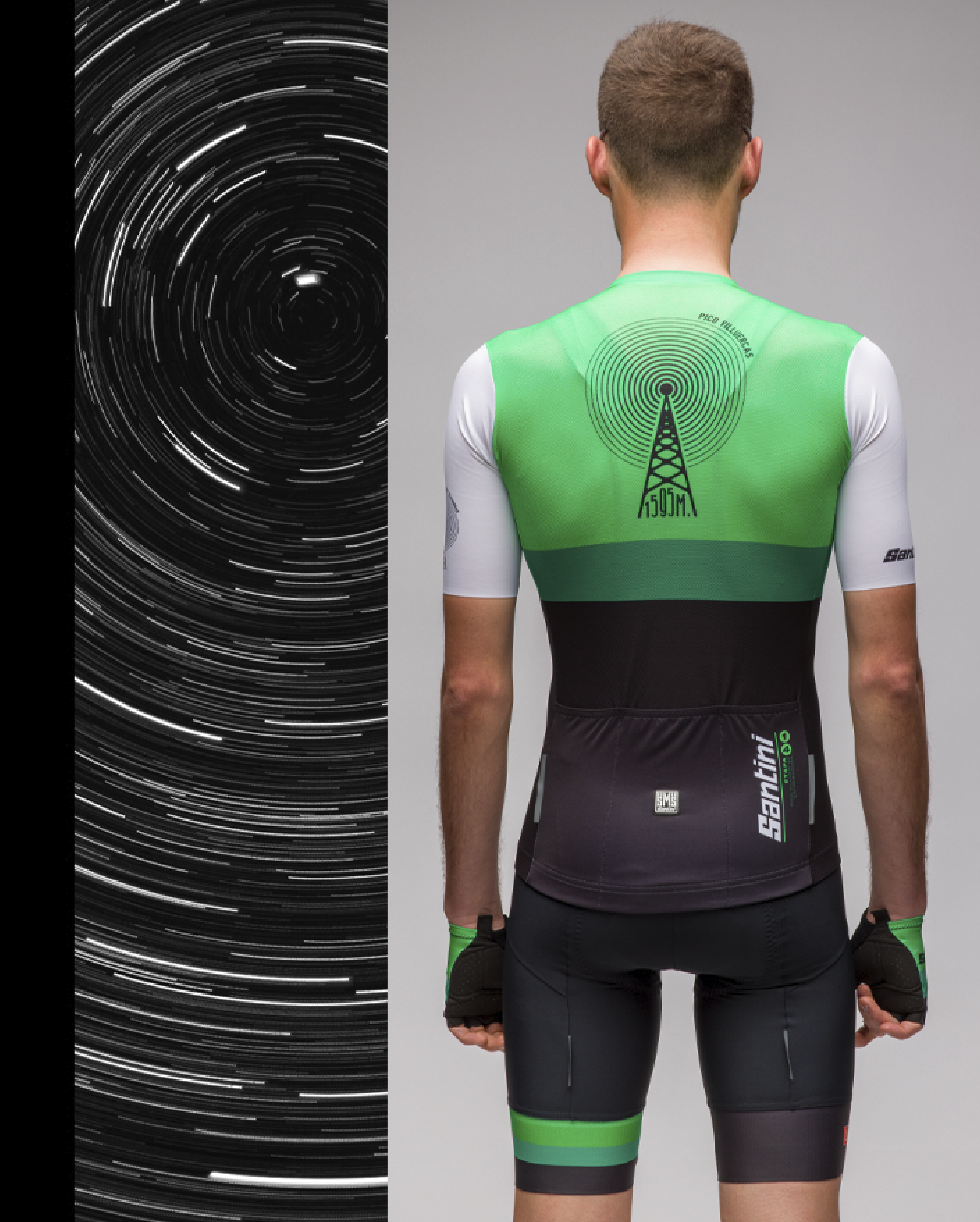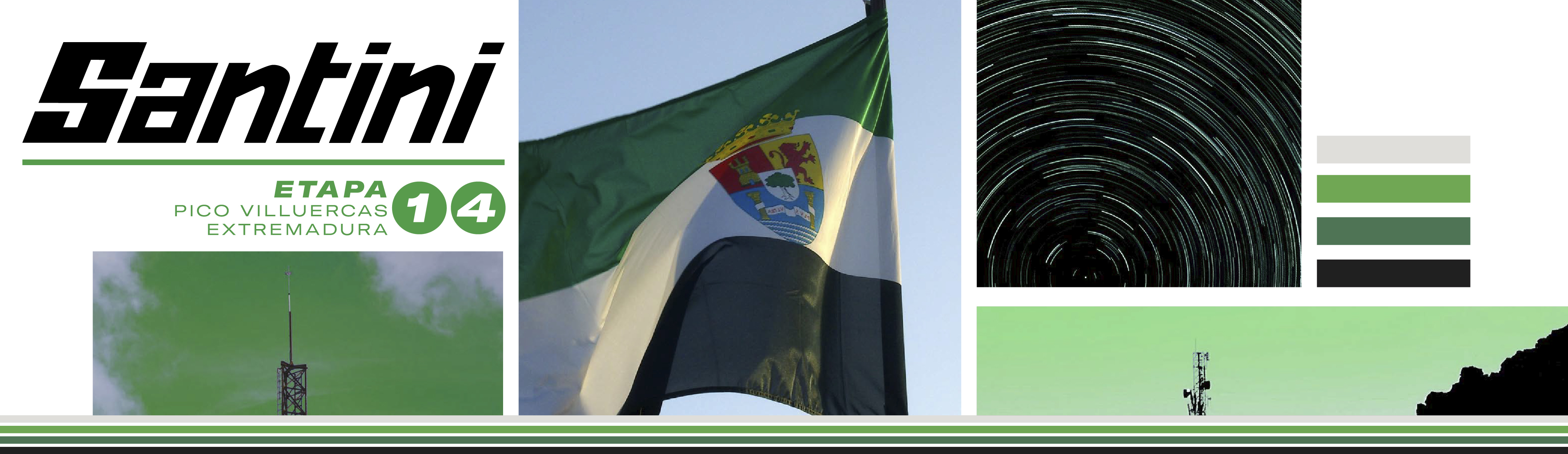 第14站車衣的設計,獻給Pico Villuercas的山頂終點。廢棄的軍事信號基地將連續兩次歡迎車手,第一次攀登是沿著一段混凝土路,坡度最大為15%。我們設計的圖形是向山頂上廢棄的無線電塔致敬,而選擇的顏色是參考埃斯特雷馬杜拉(Extremadura)的區域旗幟。