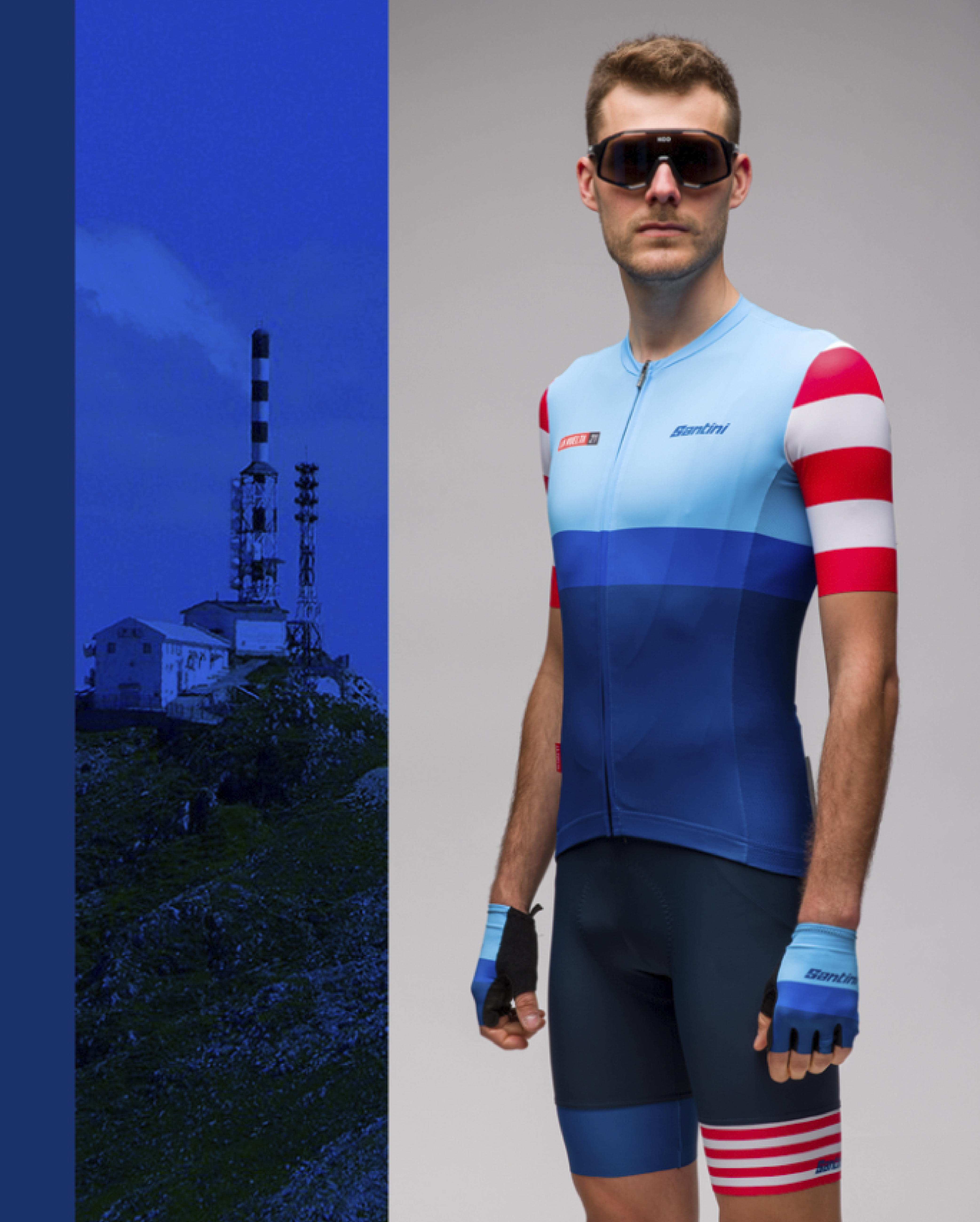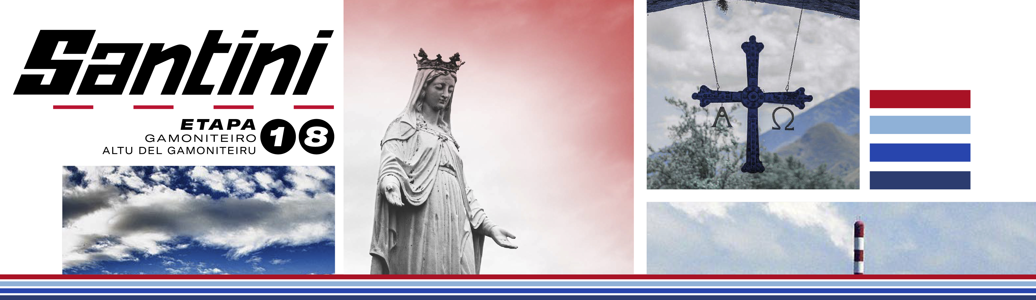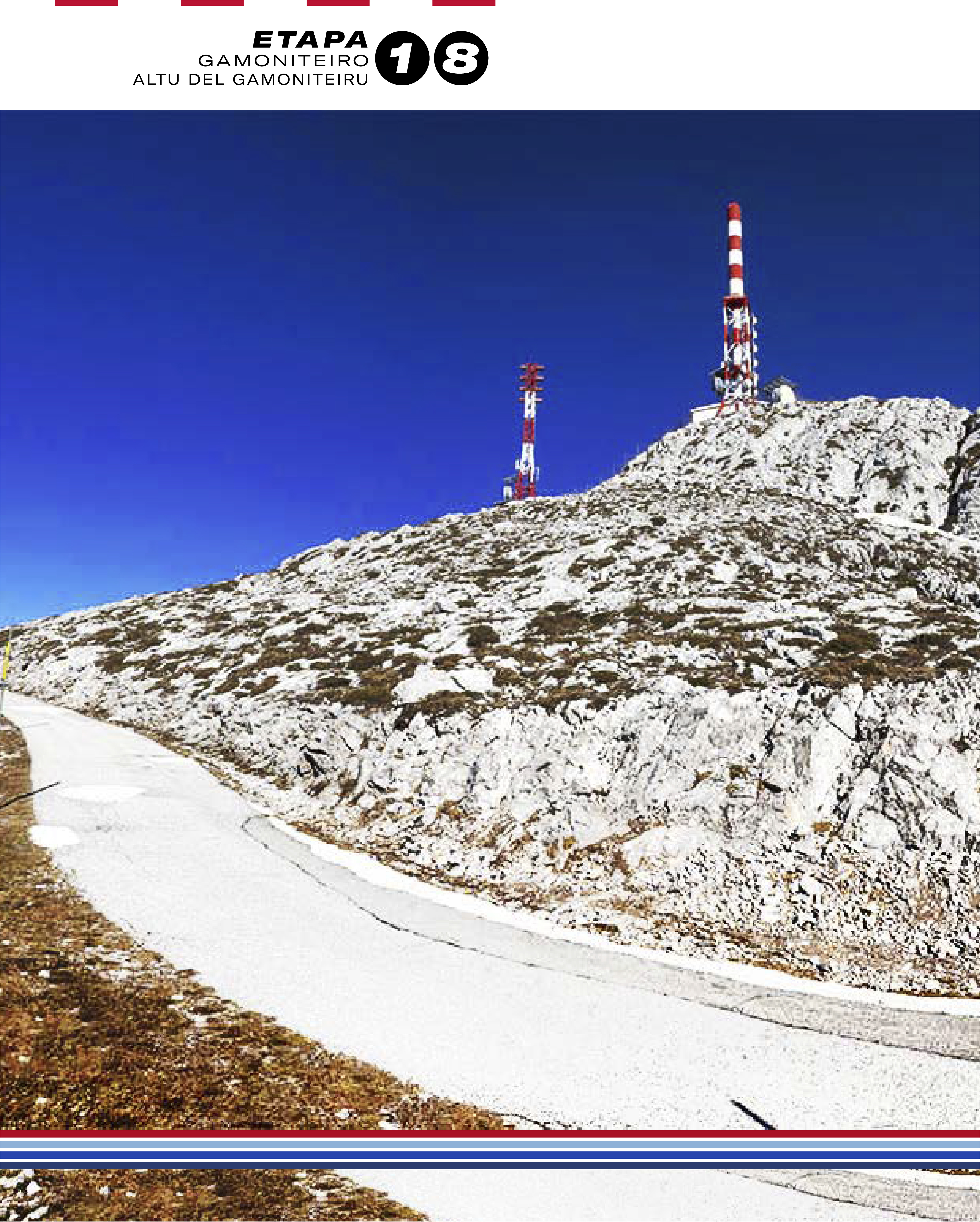 第18站是今年環西的皇后賽站,終點設在Altu d'el Gamoniteiru的山頂上,不長但是真的很嚴峻。車衣的設計從藍色漸層開始,像似從頂峰看到的天空背景。紅白條紋相間的袖子仿照獨立天線上的塗裝,在你抵達終點線時凝視著你 。
