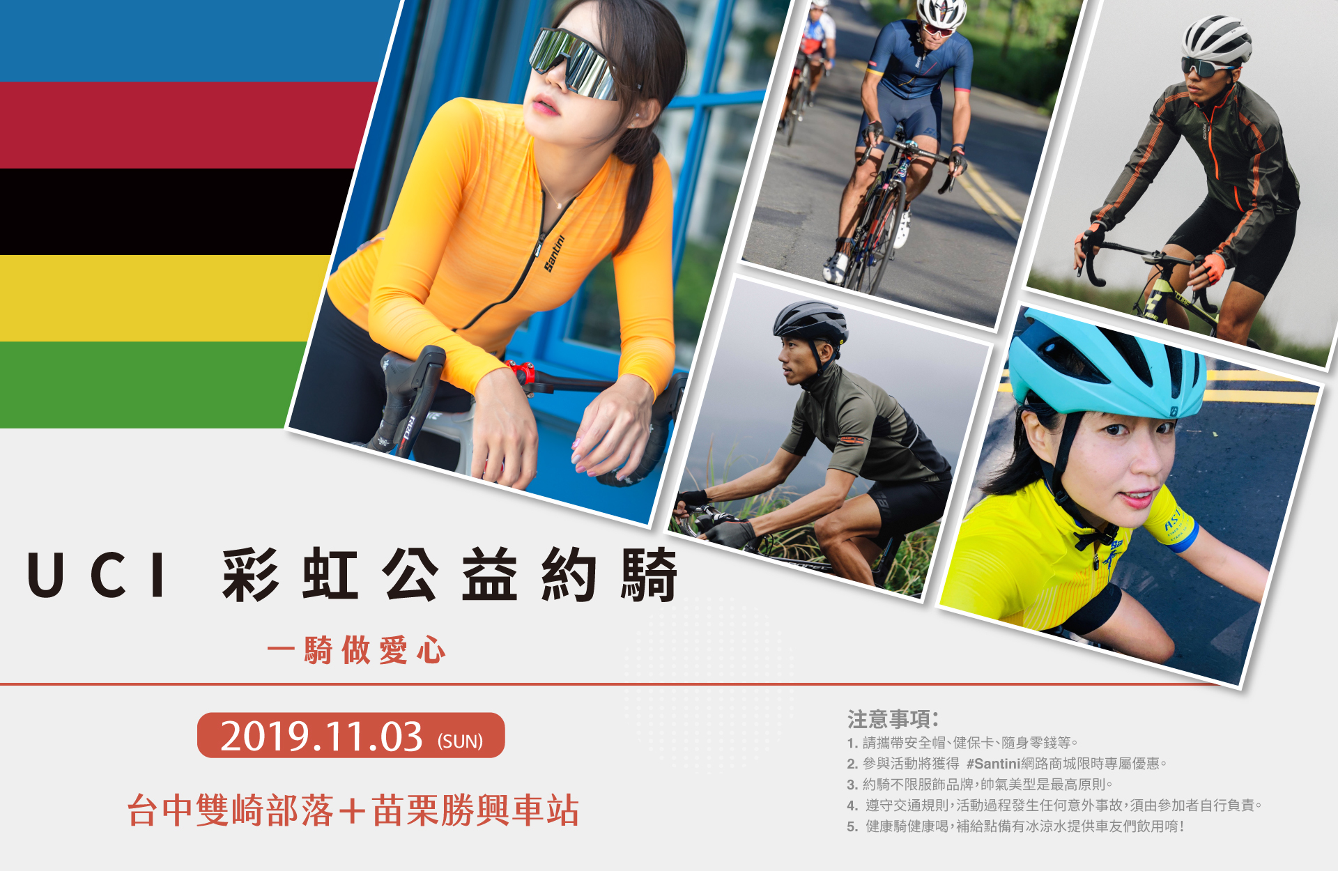 2019 Santini公益約騎 11月3日 為愛騎程。本次為聯合約騎活動四位品牌大使同時現身。此次活動中每位參加的車友每騎一公里,Santini Taiwan就捐出一塊錢做公益。在統計人數後,將善款捐給財團法人高雄私立基督教山地育幼院(六龜育幼院)。