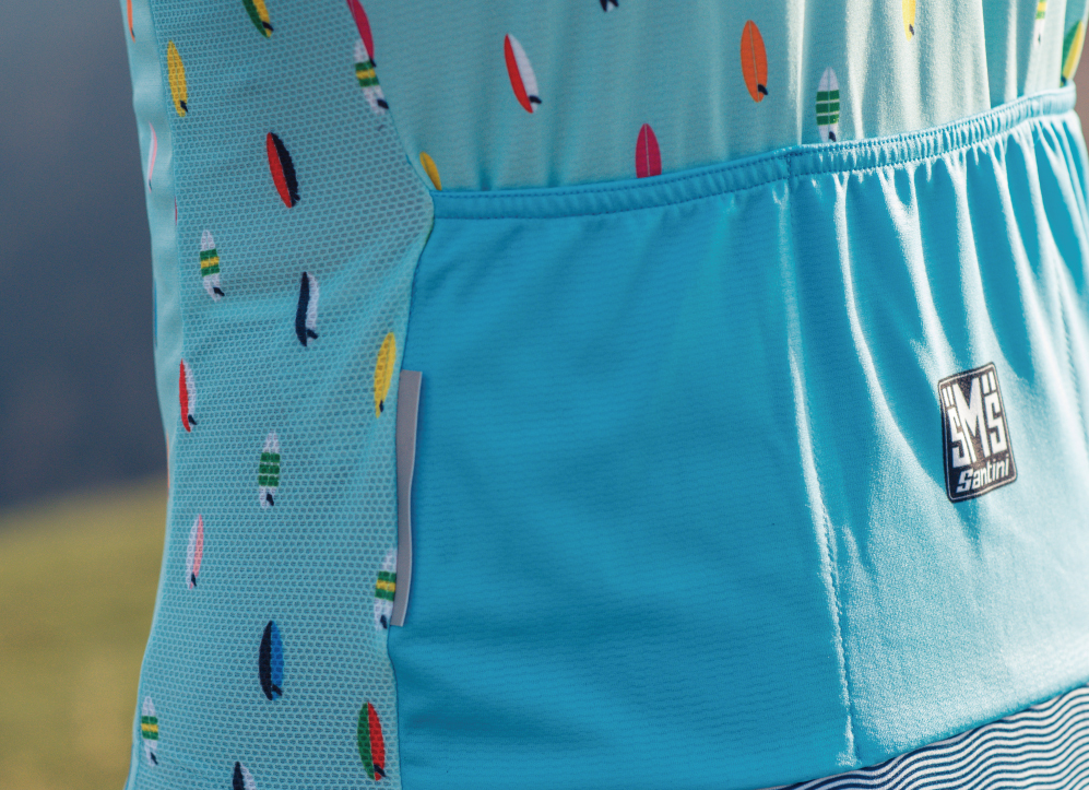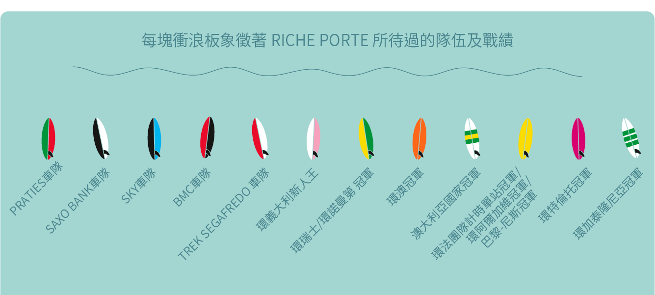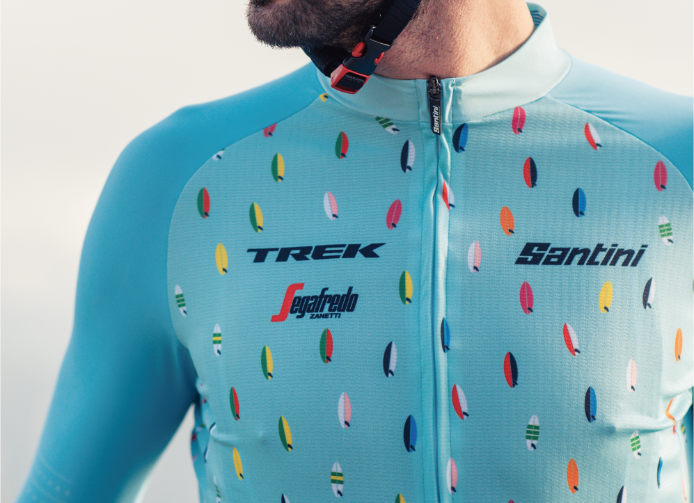 在台灣被暱稱為波堤獅的公路車好手 Richie Porte,他是來自衝浪聖地澳洲塔斯馬尼亞(Tasmania),2018年起加入Trek-Segafredo車隊,Santini特別推出Richie Porte限定設計款——「衝浪」系列,採用不同顏色的衝浪板來代表波堤獅待過的隊伍與贏過的比賽!