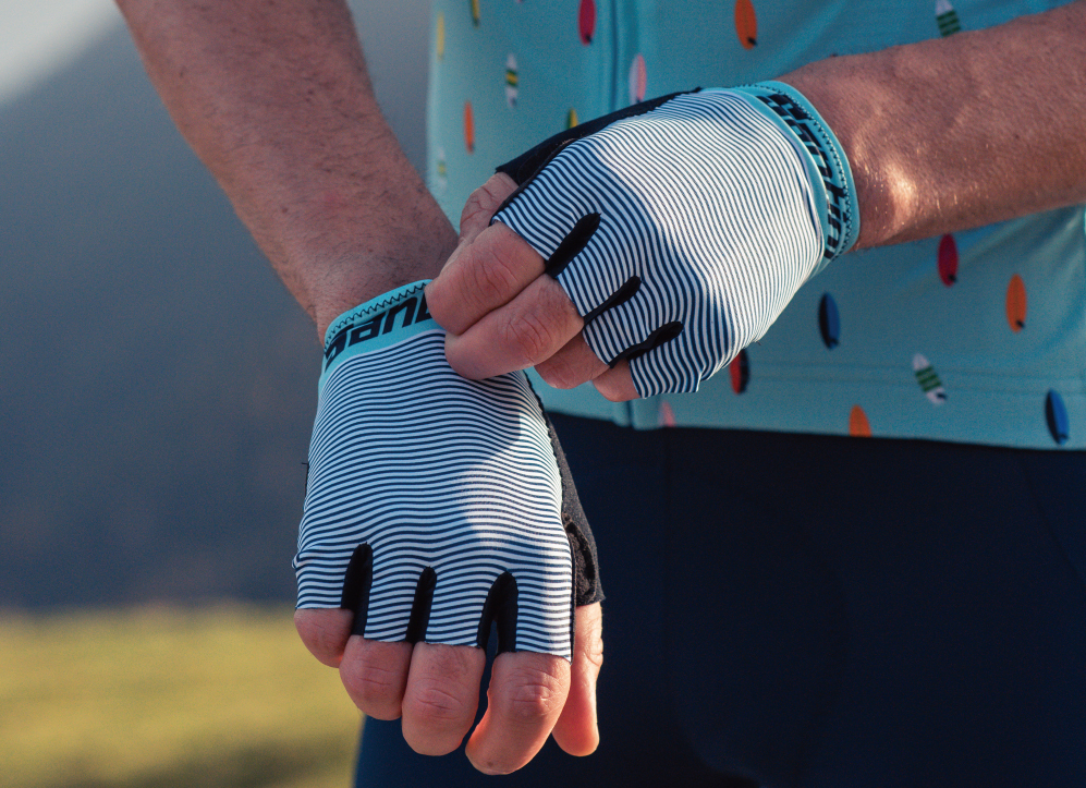 夏季短指手套,象徵海洋的波浪紋印花,掌心穩定且具吸震止滑結構,虎口處有毛巾布料可作擦汗使用。