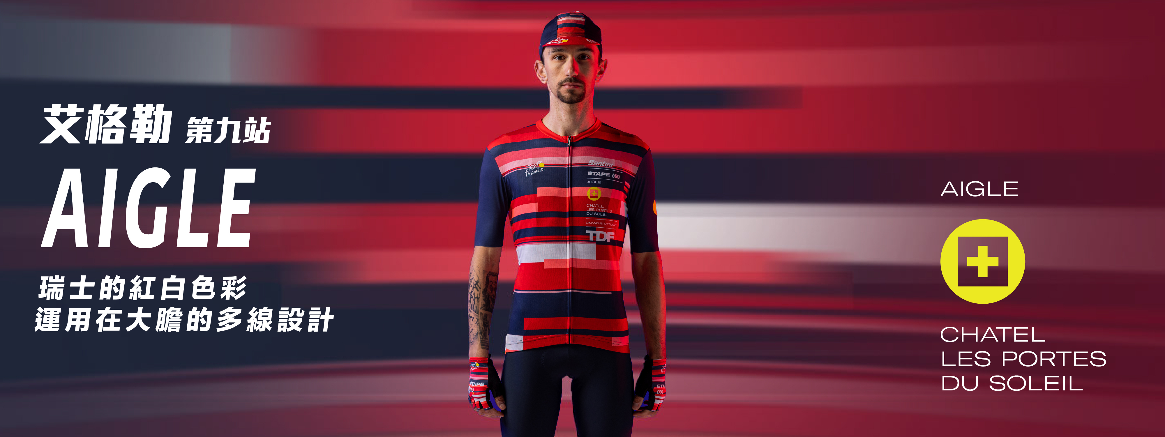 Santini這次為了這個單站打造亮眼的單站紀念套裝,以繽紛的「多線條」的主題呈現活力與大膽的視覺形象,使用紅色與白色調性參考了這個分站穿越了美麗的瑞士的事實。LOGO即為瑞士十字徽章。