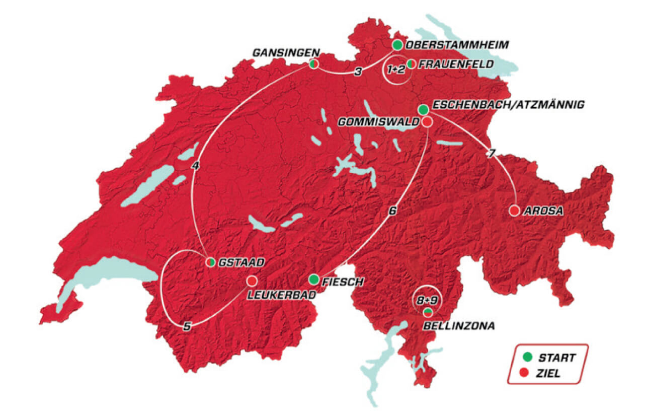環瑞士通常在六月上半月舉辦,常被車手們視為環法自行車賽的前哨站。2018年的環瑞士為期9天,今年的冠軍車手將披上Santini精心打造的冠軍衫,包含:總冠軍黃衫、衝刺王黑衫與登山王天藍衫。