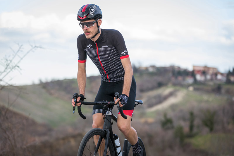 網格衫依然承襲瑞士設計風格,採用瑞士網格風格(又稱印刷風格),以瑞士十字為基礎堆砌出幾何圖樣,簡單效果營造出醒目簡潔設計的車衣,右手臂上有著「Santini + Helvetia」圖樣--向瑞士女神赫爾維蒂亞(Helvetia)致敬。