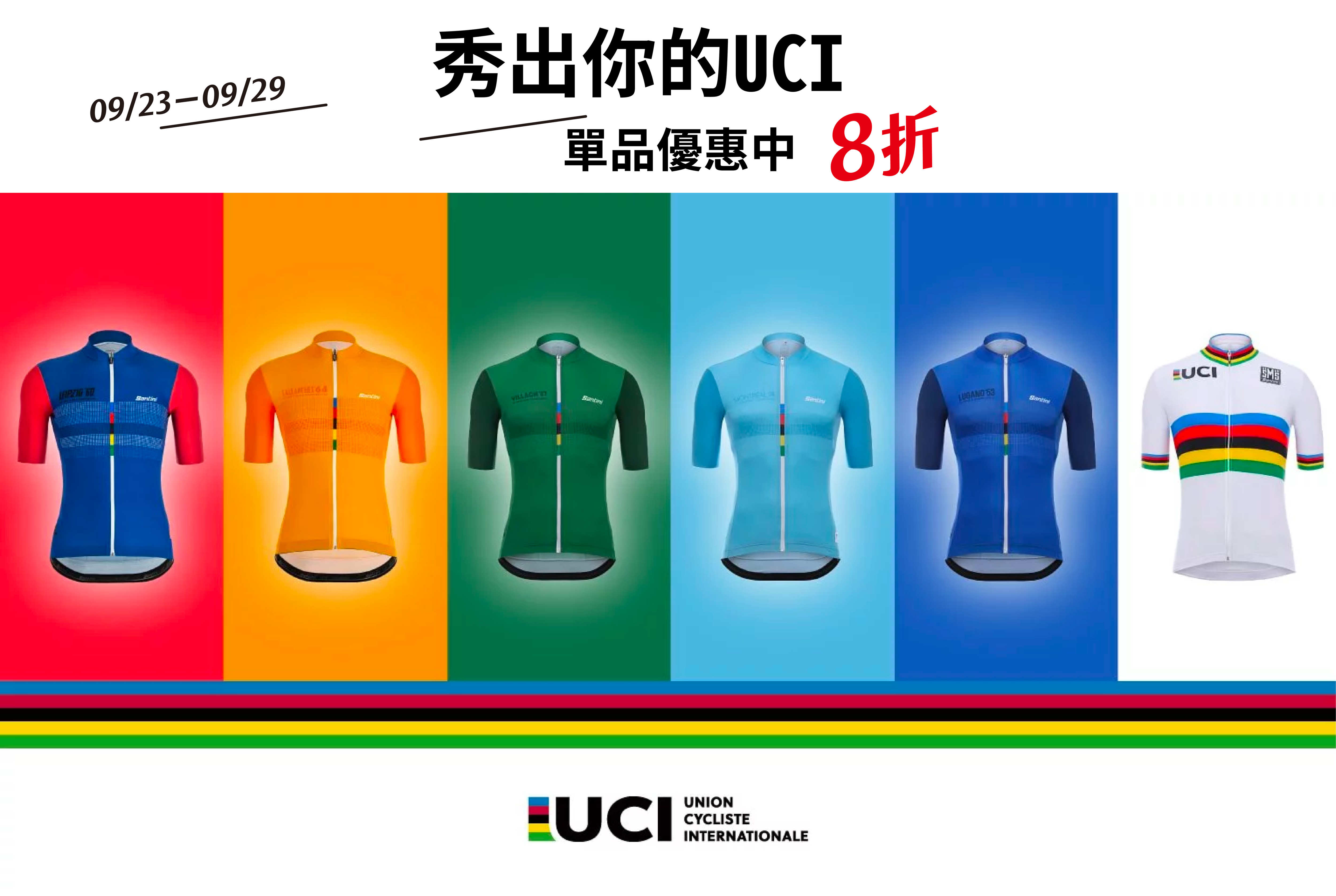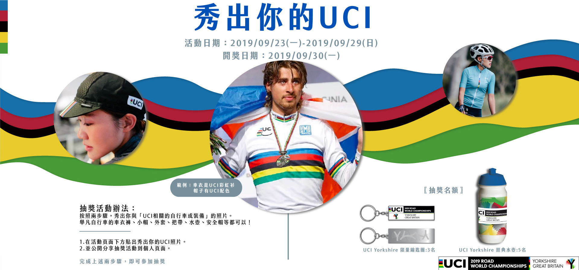 秀出你與「UCI相關的自行車或裝備」的照片在抽獎活動頁面,舉凡自行車的車衣褲、小帽、外套、把帶、水壺、安全帽等都可以!
