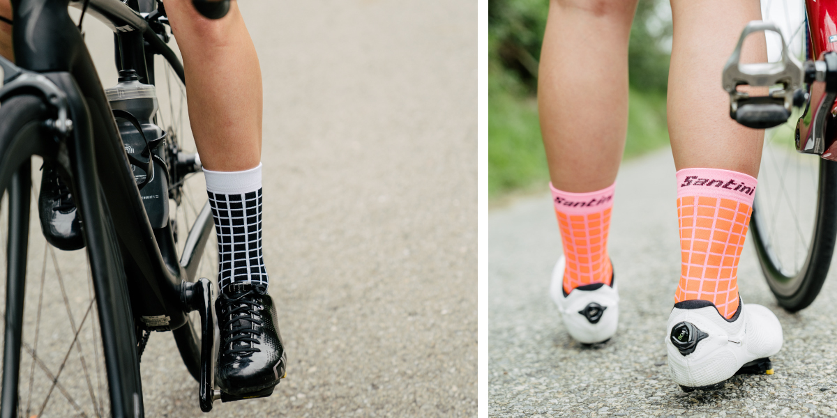而累積每一個踩踏,腳上的車襪就必須講求舒適,穿上自行車專用襪,能保持足部溫度恆定,不悶濕、發熱,甚至透過立體加壓點,加強足弓處的支撐。帶來舒適、透氣及良好的血液循環。「方格」高筒車襪,極度輕量的夏季襪子,絕佳的排汗效果和輕量,經得起長時間的騎乘。