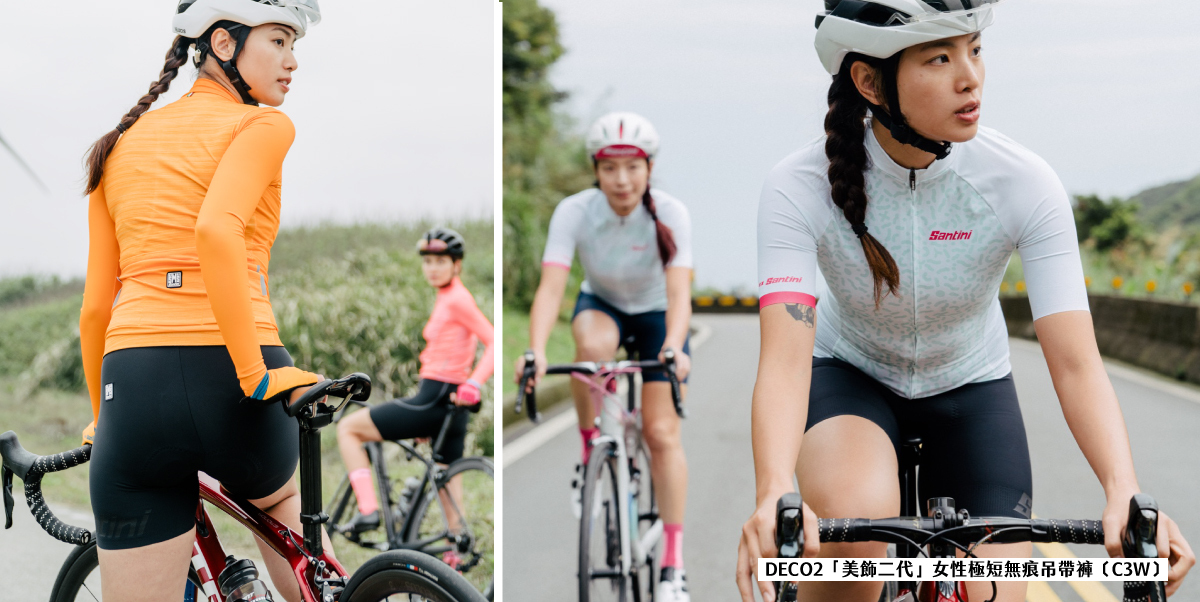 DECO「美飾」女性極短吊帶褲採用無痕褲管,舒適、美觀、高性能!採用Thunderbike Power「雷騎動力」萊卡布料。具高彈性與壓縮效果可減緩肌肉緊繃。搭配頂規C3W襯墊,防臭抗菌表布襯墊,耐用時數可達7小時以上。適合參與長程競賽,挑戰的專業女騎士。