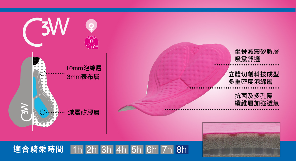 好的車褲讓你上天堂,面對挑戰武嶺的騎乘少說也要3~4個小時,長時間踩踏,車褲的舒適將是很重要的決勝關鍵。相較以往騎乘經驗,挑戰武嶺的路程上是不斷爬升,除非起身抽車,否則過程中鮮少會有離開座墊的機會,因此車褲在選擇上需要能提供良好的支撐及透氣性。此外,考量長時間騎乘,車褲布料的選用也需要有壓縮效果,以減緩肌肉疲勞、延長耐力。