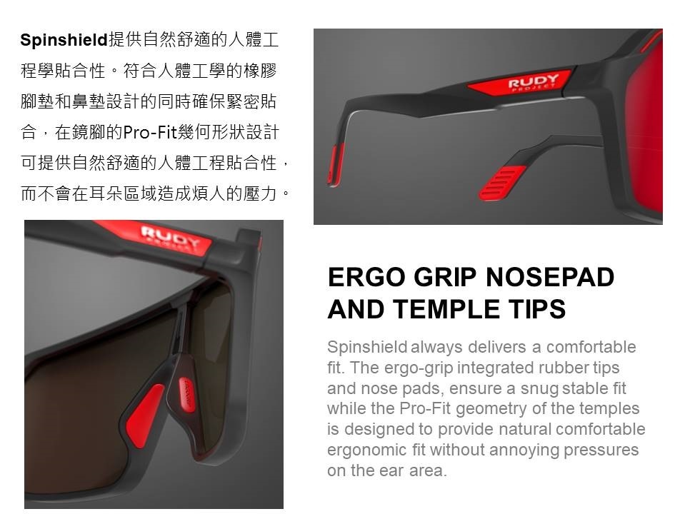 Spinshield提供自然舒適的人體工學貼合性。符合人體工學的橡膠腳墊和鼻墊,設計的同時確保緊密貼合;在鏡腳的 Pro-Fit 幾何形狀設計,可提供自然舒適的人體工程貼合性,而不會對耳朵區域造成煩人的壓力。